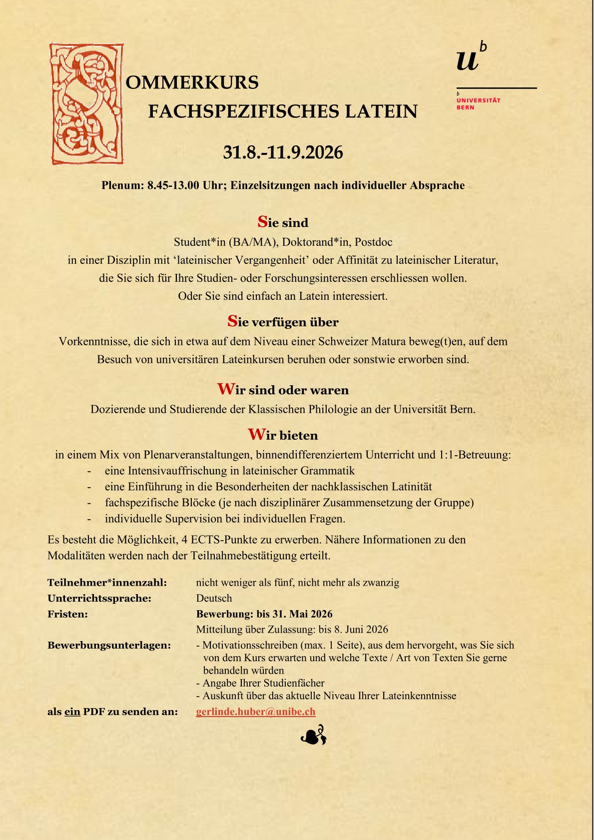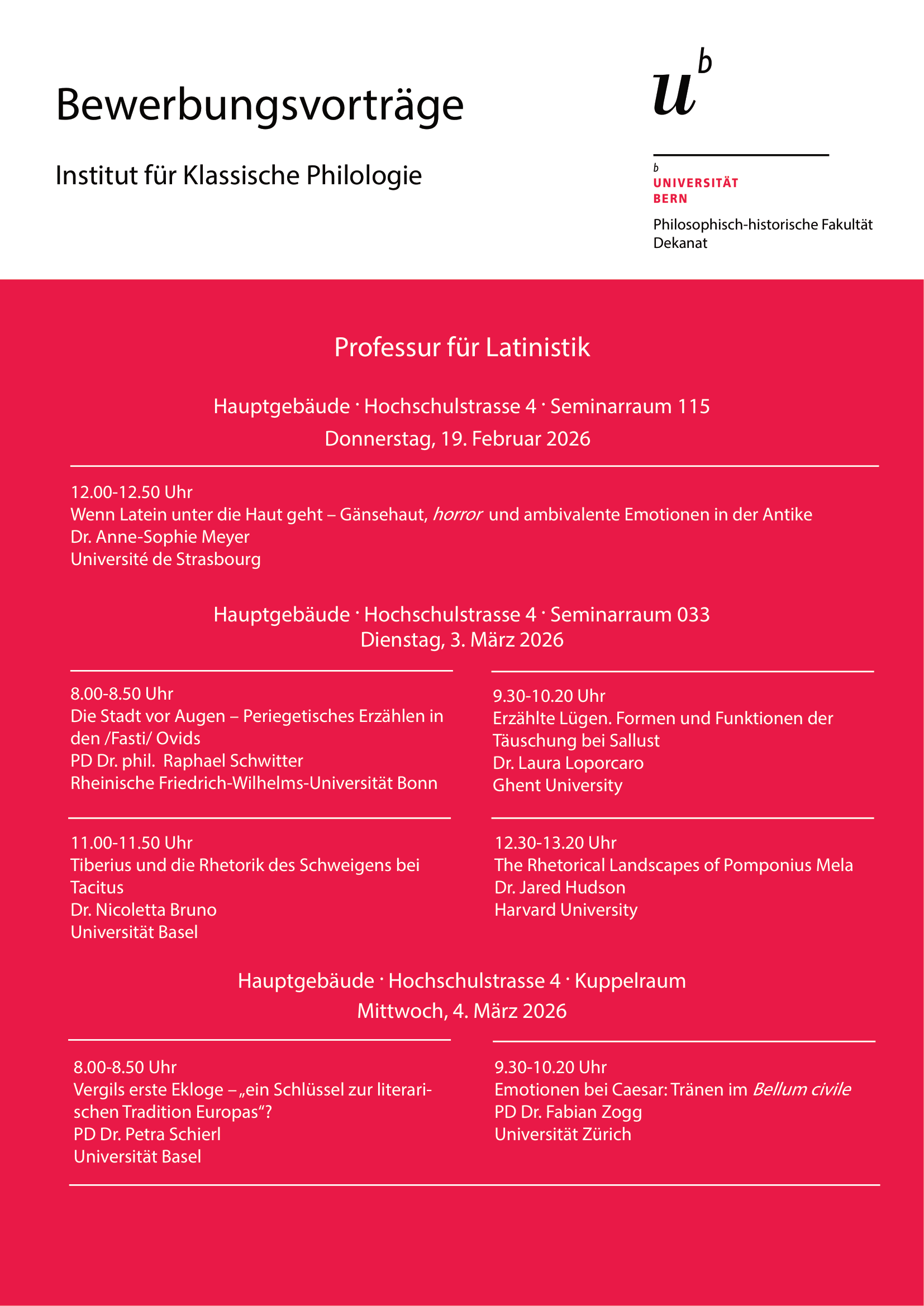 Das Institut für Klassische Philologie lädt am Dienstag (3. März 2026) und am Mittwoch (4. März 2026) herzlich zu den Bewerbungsvortägen für die Wiederbesetzung der Professur für Latinistik ein.